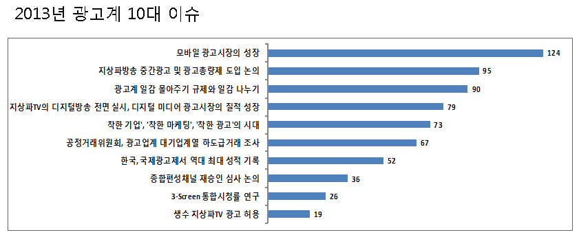 이밖에도 2013 광고계 주요 이슈로 △지상파TV의 디지털방송 전면 실시, 디지털 미디어 광고시장의 질적 성장 △‘착한 기업’, ‘착한 마케팅’, ‘착한 광고’의 시대 △공정거래위원회, 광고업계 대기업계열 하도급거래 조사 △한국, 국제광고제서 역대 최대 성적 기록 △종합편성채널 재승인 심사 논의 △3-Screen 통합시청률 연구 △생수 지상파TV 광고 허용 등이 꼽혔다.