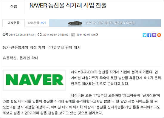 네이버의 농산물 직거래 사업 진출 내용은 <한국경제> 7일자 보도(6일 온라인판)를 통해 알려졌다. 한경은 기사에서 “네이버가 오는 17일부터 오픈마켓 ‘체크아웃’에 ‘산지직송’이라는 별도 페이지를 만들어 농산물 직거래 판매를 본격화한다”고 전했다.