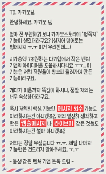 카카오에 보내는 편지 형식으로 쓰인 해당 공지는 “시가총액 7조원하는 대기업에서 작은 벤처 기업의 아이디어를 도용하시다니요. 이 기능은 저희 직원들이 쌍코피 흘려가며 만든 기능이라구요”라며 항의성 목소리를 내고 있다.