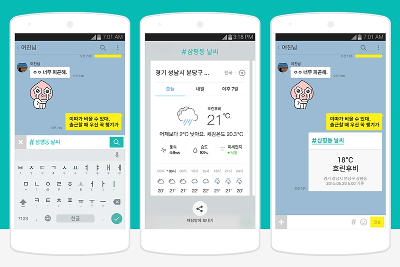카카오톡 대화 입력창에 있는 샵(#) 버튼을 누르고 원하는 키워드를 입력하면 바로 검색 결과를 확인할 수 있다.