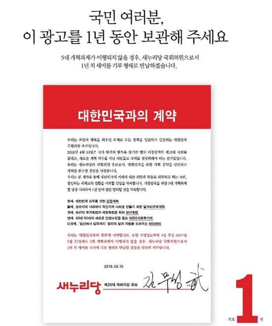 광고 말미에는 국회의원 후보의 자격으로 김무성 대표의 친필 서명과 똑같은 계약서에 서명한 후보들의 명단이 나열돼 있다. ‘보관해달라’는 카피에 걸맞게 우측에는 해당 광고를 잘라서 보관할 수 있는 절취선도 볼 수 있다.