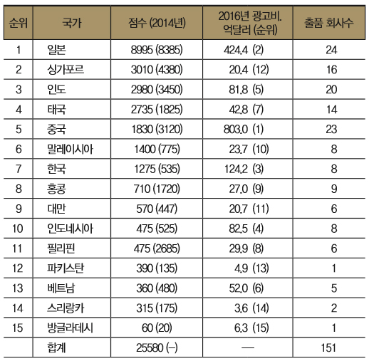 미디어 전문 대행사인 제니스옵티미디어(ZenithOptimedia)가 지난 3월에 발표한 광고비를 보면 한국은 중국(803억달러)과 일본 (424억달러)에 이어 아시아 3위(124억달러) 시장인데, 크리에이티브 순위는 그보다 4계단 낮은 7위인 것이다. 참고로 중국은 광고비 규모에서 지난 2010년 일본을 앞질러 현재는 미국에 이은 세계 2위다.