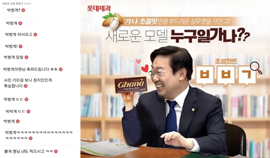 롯데제과가 자사 페이스북을 통해 가나초콜릿의 새로운 광고모델을 맞추는 이벤트를 시작했다. 그런데 난데없이 박범계 더불어민주당 의원이 유력한 후보(?)로 거론돼 재미를 주고 있다.