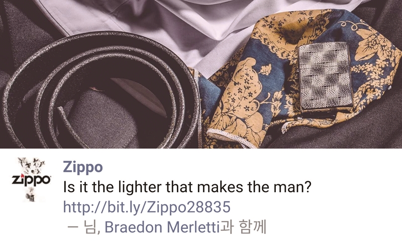 물론 깔끔하고 세련된 남성미를 지향하는 새천년 세대의 취향도 잊지 않는다. 일례로 과거 브룩스 브라더스 브랜드의 카탈로그를 연상케 하는 비즈니스 출장 양복과 벨트, 손수건 사진 위에 살짝 지포 라이터를 얹어놓고 “그를 진정한 남자로 만들어주는 것은 바로 지포 라이터가 아니냐?”라는 페이스북 포스트를 올렸다. 아주 잘 계산된 메시지다.