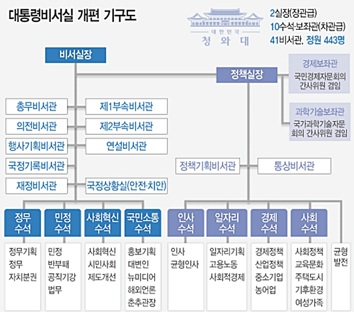 참여정부 시행됐던 정책실장을 부활시켰고, 그 밑으로 일자리·경제·사회수석과 경제·과학기술보좌관을 설치하기로 했다.