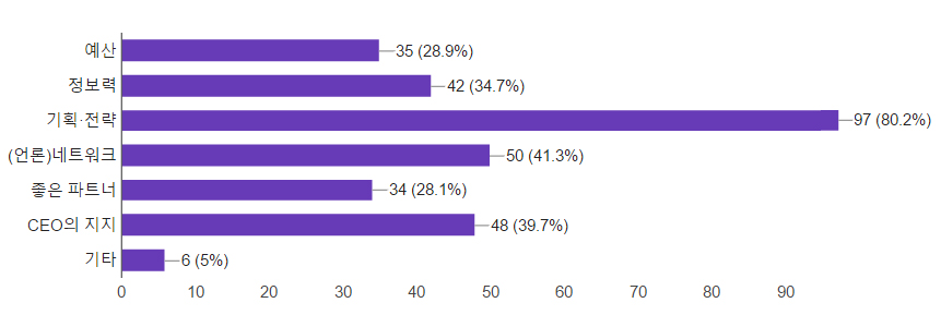 이어 (언론) 네트워크 50명(41.3%), CEO의 지지 48명(39.7%), 정보력 42명(34.7%), 예산 35명(28.9%), 좋은 파트너 34명(28.1%), 기타 6명(5%) 순으로 나타났다. 홍보의 본질에 집중하는 것이 무엇보다 중요하다는 답변으로 풀이된다. 차별화된 기획과 전략을 세우면 어떻게든 통한다는 얘기다.