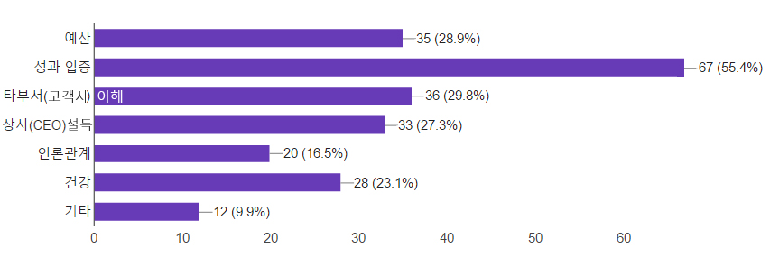PR인들이 업무에서 가장 큰 고민을 느끼는 지점은 ‘성과입증’으로 조사됐다. ‘현재 업무 진행에 있어서 가장 큰 고민 거리(고충)는?’이라는 질문에 67명(55.4%)이 성과입증을 일순위로 꼽았다. 그 뒤로 타부서(고객사)이해 36명(29.8%), 예산 35명(28.9%), 상사(CEO)설득 33명(27.3%), 건강 28명(23.1%), 언론관계 20명(16.5%), 기타 12명(9.9%)으로 집계됐다.