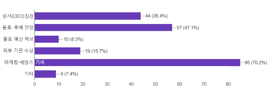 공들여 만든 콘텐츠가 SNS에서 많이 공유되거나 브랜드 기사가 대서특필돼 매출 향상 등 가시적인 성과를 낼 때 자부심을 갖는 것으로 해석된다. 또한 동료 및 후배에게 인정받는 것을 상사의 칭찬보다 기분좋게 생각했으며, 상대적으로 외부 기관 수상, 필요한 예산 확보는 만족감에 영향을 주지 못했다.