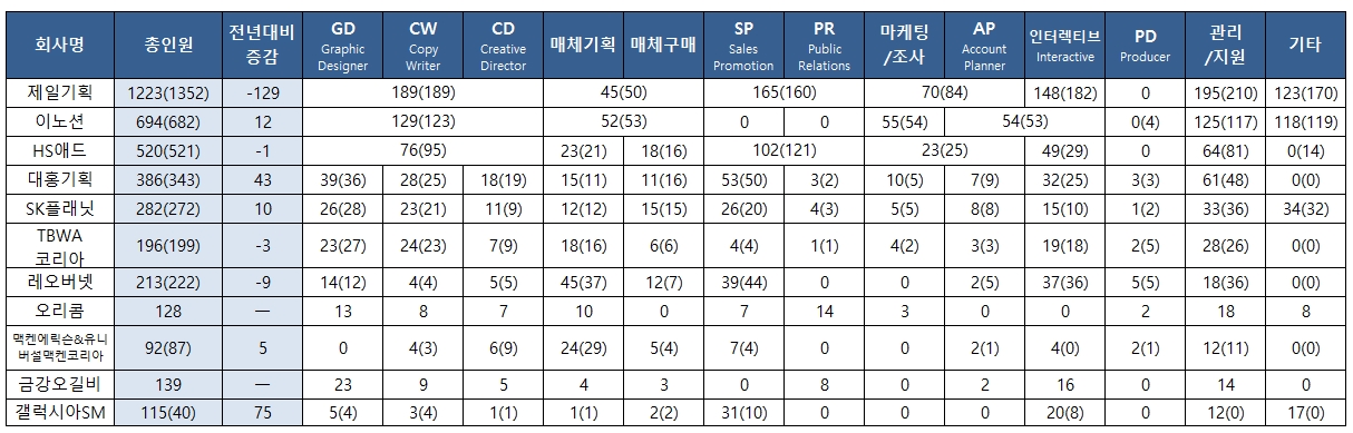 제일기획은 규모 면에서 큰 폭의 차이로 부동의 선두자리를 유지했지만 그만큼 인력의 감소폭도 컸다. 2014년 1391명에서 2015년 1352명으로 줄어든 데 이어 2016년에도 121명이 감소해 1223명을 기록했다. 인력구조상 가장 큰 비중을 차지하는 AE(Account Executive)가 272명에서 일년 새 255명이 됐고 인터랙티브 182명→148명, 마케팅·조사 및 AP(Account Planner) 84명→70명을 기록했다. 반면, SP(Sales Promotion) 및 PR(Public Relations)은 160명에서 165명으로 소폭 증가했다.