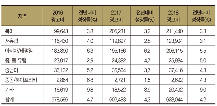 지역별로 보면 북미, 서유럽, 아시아 태평양이 각각 1000억달러를 넘는 광고비를 기록하며 전체의 86%를 점하고 있다. 그 중에서도 중국, 인도, 인도네시아 등 경제 성장 속도와 비례해 광고시장이 빠르게 확대되고 있는 신흥경제국이 모여 있는 아시아 태평양이 18.4%로 가장 가파른 성장률을 보인다.
