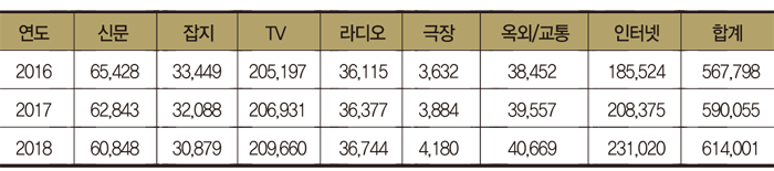 매체별로는 올드미디어와 뉴미디어의 상황이 대비된다. 이미 상식처럼 된 일이지만 인쇄매체인 신문과 잡지는 2018년까지 광고비가 7% 정도 감소할 전망이다. TV와 라디오는 각각 2.2%, 1.7% 증가하고 옥외/교통광고는 5.8% 늘어날 것으로 예측됐다.