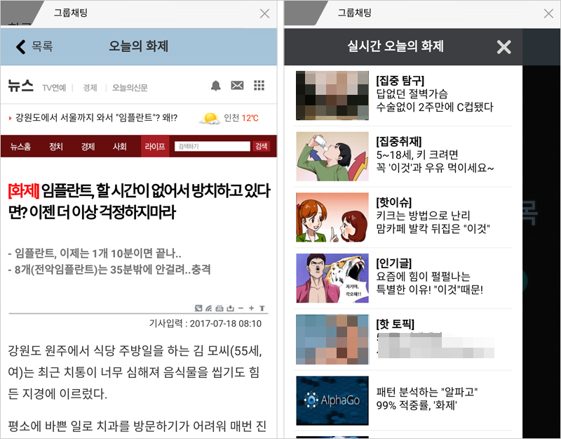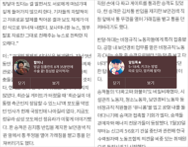 실제 이 광고는 카톡의 특성을 고스란히 차용했다. 모양도 흡사하지만 기사를 스크롤하며 읽어 내리는 중간에 갑자기 팝업창이 나타나 카톡 메시지라는 착각을 불러일으키게 한다.