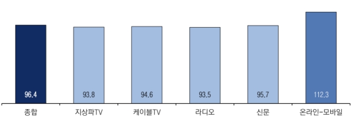 매체별 KAI지수를 살펴보면 지상파TV 93.8, 케이블TV 94.6, 라디오 93.5, 신문 95.7로 모두 감소세를 보이는 가운데, 온라인-모바일만 112.3를 기록하며 홀로 상승곡선을 그렸다.