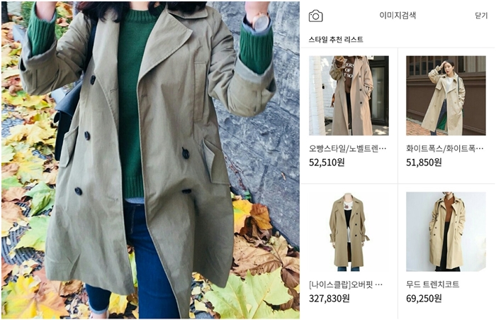 품목을 바꿔보기로 합니다. 지난 주말 찍었던 사진 한 장을 사진첩에서 불러와 검색! 가을엔 역시 트렌치코트니까요.