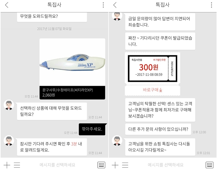 “금일 문의량이 많아 지연되었다”는 말을 전하며 다음날까지 사용 가능한 톡집사전용 ‘300원 쿠폰’을 선물해줬습니다. 설렘 반 기대 반 마음을 달래기엔 아쉬운 답변입니다.
