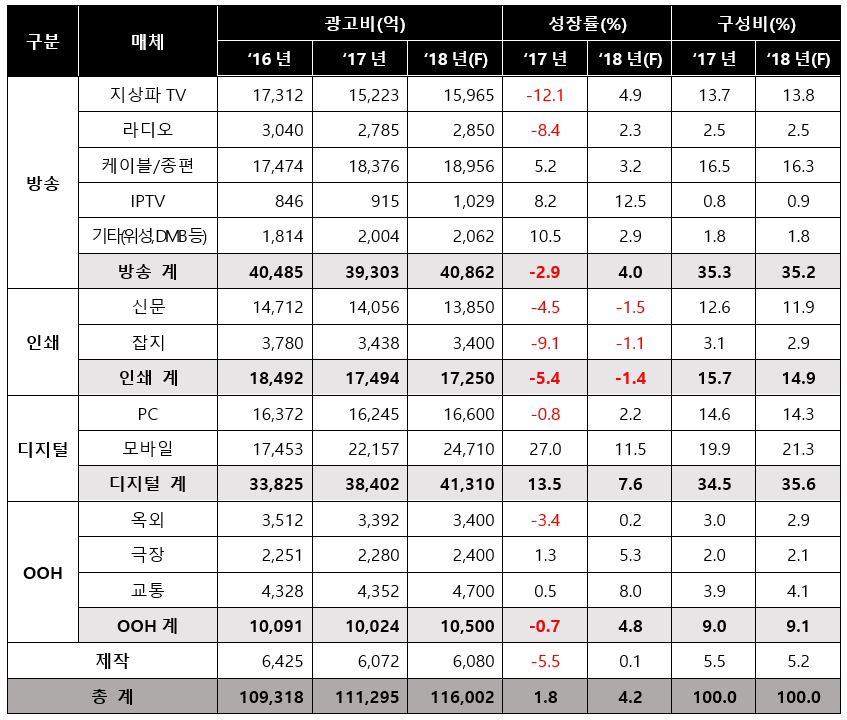 2018년 광고 시장은 지난해(11조1295억원)보다 4.2% 성장한 11조6002억원으로 전망됐다.