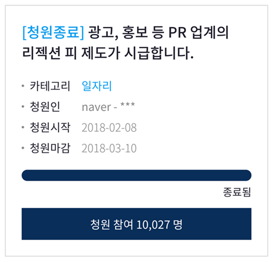 2월 8일 청와대 국민청원에는 ‘광고, 홍보 등 PR업계의 리젝션 피 제도가 시급합니다’라는 제목의 글이 올라왔다. 글쓴이는 서비스 대행을 맡기는 클라이언트가 ‘갑’이라는 우월적 지위를 이용해 양질의 제안(서)을 공짜로 받는 걸 당연시하는 문화가 개선돼야 한다며 ‘리젝션 피(Rejection Fee, 탈락보상금)’ 도입을 주장했다.