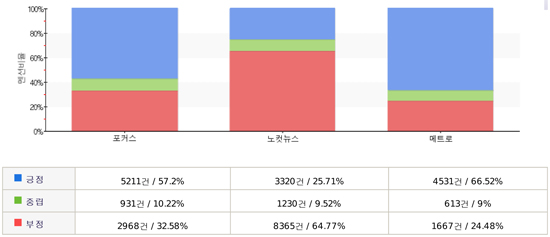 마지막으로 감성분석을 기반으로 점수를 매긴 ‘소셜호감도’에서는 포커스와 메트로가 각각 71.3점, 71.2점으로 비슷한 호감도를 보였다. 하지만 긍정보다 부정적 의견이 두 배 이상 많은 것으로 나타났던 노컷뉴스는 54.6점을 얻으며 타 무가지에 비해 호감도 면에서 크게 뒤쳐졌다.