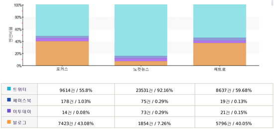 하지만 노컷뉴스는 버즈의 대부분인 2만3531건(92.16%)이 트위터에서 발생하는 특이점을 보였는데(블로그에선 1854건, 7.26%), 이는 포커스·메트로 두 무가지의 트위터 버즈량을 합친 건수보다 많은 수치다. 또 이들 무가지 모두 트위터나, 블로그에선 버즈량이 많았으나 페이스북이나 미투데이에서는 미미한 버즈량을 보였다.