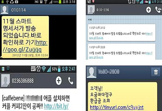 이밖에 ‘독도는 우리땅’이라고 적힌 문자를 보내 애국심을 이용하거나 건강보험공단을 사칭해 무료 암검진 문자를 발송하는 스미싱도 빈번했다.