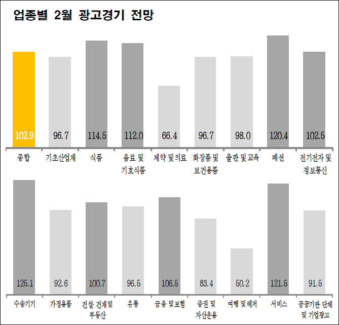 이에 비해 제약 및 의료(66.4), 증권 및 자산운용(83.4), 가정용품(92.6), 공공기관·단체 및 기업광고(91.5) 등의 업종은 부진할 것으로 보인다. 특히 여행 및 레저(50.2)의 경우, 전달인 1월 대비 광고물량이 절반가량이나 줄어들 것으로 나타났다.