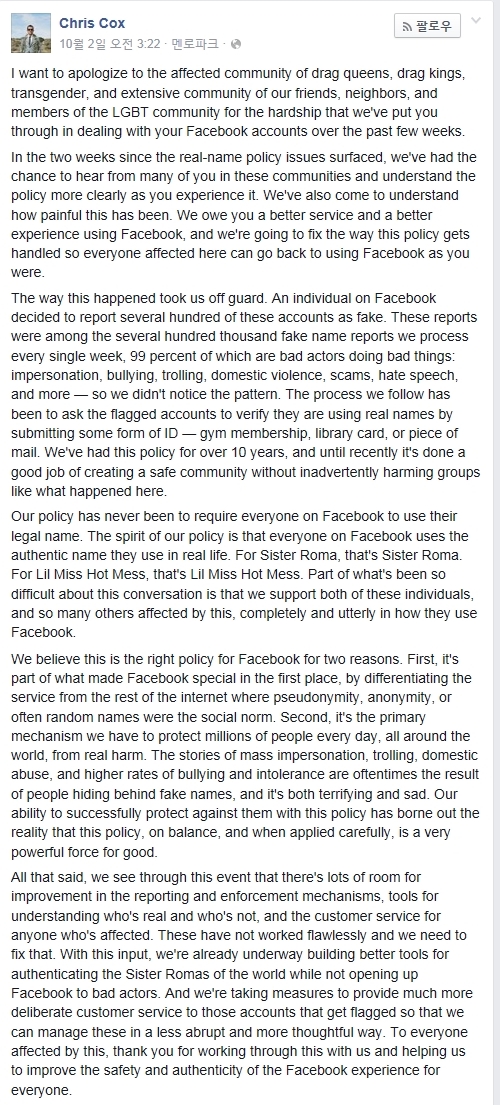 이어 “우리 정책은 결코 페이스북에서 자신의 법적 이름만을 사용하기를 요구하지 않는다”며 “우리 정책의 목적은 페이스북을 사용하는 모든 사람들이 그들의 실제 생활에서 사용하는 ‘진짜 이름’을 사용하도록 하는 데 있다”고 설명했다.