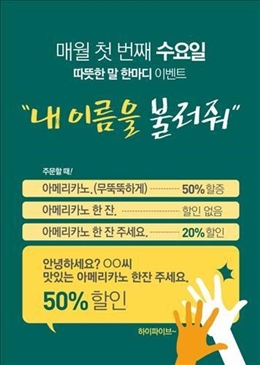 ‘따뜻한 말 한마디’라는 이름의 이 캠페인은 매주 첫째 수요일 매장을 방문한 고객이 명찰에 적힌 바리스타의 이름을 부르며 “안녕하세요? ○○씨 맛있는 아메리카노 한 잔 주세요” 등 공손하고 정중하게 주문하면 최대 50% 할인 혜택을 받는다.