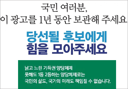 야권 분열로 인해 세자릿수 의석 확보에 ‘빨간불’이 켜졌다는 평가가 나오고 있는 더불어민주당은 이날 <한겨레> <경향신문>등의 일간지와 <한국경제> 등 경제지 1면 하단에 광고를 실었다.