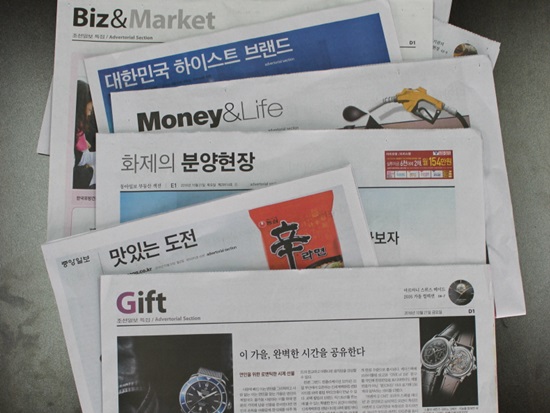 중앙지들은 소위 섹션지면에 광고기사를 도배해왔는데, 최근 들어 여기에 작은 글씨로 ‘Advertorial section’이라고 표시하기 시작했다. 부동산 분양, 선물, 명품 브랜드 등이 다양하게 소개된다.