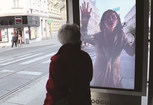 해외에선 옥외광고에 AR을 적용하는 사례도 속속 나타나고 있다. 오스트리아의 방송국 스카이 오스트리아가 TV드라마 ‘워킹 데드’를 홍보하기 위해 전차 정류장에 설치한 스크린이 대표적인 케이스다. 단순한 유리벽인줄 알았던 스크린 속에서 좀비가 갑자기 나타나 사람을 깨물거나 벽을 때리자 소스라치게 놀라는 시민들의 모습이 재미를 준다.