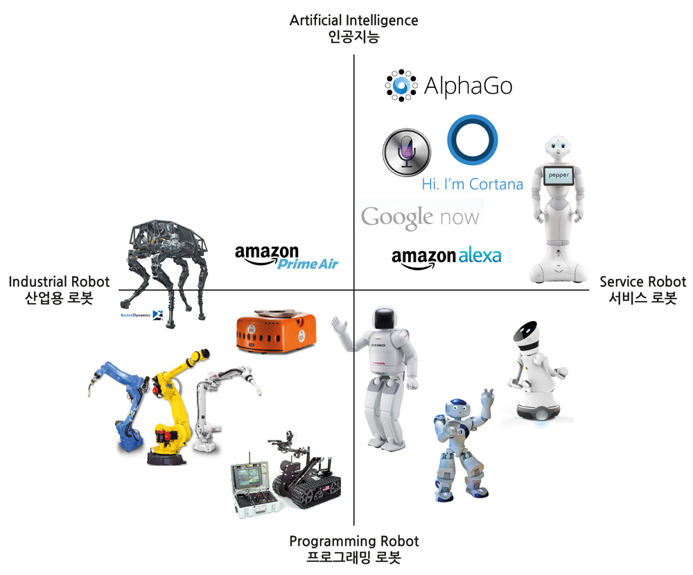 최근엔 특히 인공지능과 서비스 영역의 로봇들이 주목을 끌고 있다. 인공지능 영역에서는 알파고를 비롯해 음성제어시스템(Voice Control System)의 대명사이자 자연어 처리가 가능한 애플의 시리(Siri), 구글 시스템과 연동돼 사용자 패턴을 인식하고 필요한 정보를 묻기도 전에 알려주는 구글 나우(Google Now), 소비자 라이프스타일에 맞춰 그들만의 API를 통해 최적화된 서비스를 제공하는 아마존의 알렉사(Alexa), 자사 클라우드 서비스 ‘에저’를 통해 수많은 음성 인식 데이터를 보유, 분석·해석하는 머신러닝을 적용시킨 MS의 코타나(Cortana) 등이 있다.