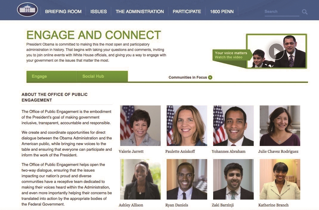 미 오바 마 행정부는 2009년 백악관에 ‘오피스 오브 퍼블릭 인게인지먼트(OPE)’를 창설했는데, 이와 관련한 기자회견에서 오바마 대통령은 OPE가 “연방정부에 국민들이 의미 있는 참여를 늘림으로써 미국인들과의 관계를 만드는 업무를 도울 것”이라고 밝힌 바 있다.