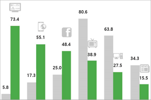 반면 지상파TV(38.9%)와 신문(15.5%)을 꼽은 답변률은 낮았다. 2012년과 비교하면 지상파TV는 무려 41.7%P 떨어졌고 신문은 18.8%P 하락했다고 DMC미디어 측은 설명했다.