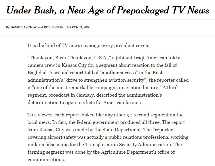 이라크 사담 후세인 정권이 대량살상무기를 갖고 있다는 정보를 가공해 이라크를 침공했던 부시 정권은 대량살상무기가 없었다는 사실이 알려지면서 정치적 위기를 맞는다. 특히 부시가 재임에 성공한 후 이런 현상은 더 심해졌는데, 2005년 뉴욕타임스는 방송뉴스에서 계속되는 부시 정권 홍보성 보도의 이면에 정부 조직이 제공한 VNR의 출처를 밝히지 않고 그대로 쓰이는 문제를 고발하는 특집기사를 낸다.