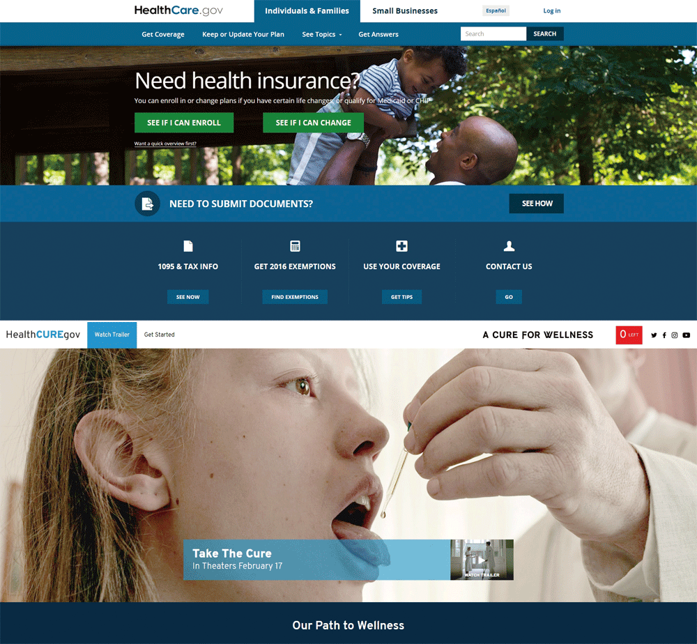 반면 최근 20세기 폭스사가 영화 ‘어 큐어 포 웰니스(A Cure For Wellness)’ 홍보를 위해 가짜뉴스를 만든 경우는 조금 다르다. 폭스사의 홍보 대행을 맡은 뉴레전시 프로덕션은 지역 일간지 이름을 연상케 하는 5개의 가짜뉴스 사이트와 미 정부의 의료보험 관련 공식 웹사이트(HealthCare.Gov)를 모방한 ‘HealthCureGov.com’이라는 사이트를 만들고 자극적인 제목의 가짜뉴스를 올렸다.
