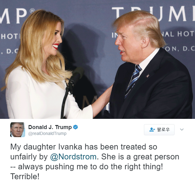 노드스트롬이 이방카 브랜드를 퇴출한 배경은 정치적 이유가 아니라 판매 실적이 저조해서인데 앙심을 품고 보복을 한 저열한 처신이었다. 이에 대해 미국인들은 “이게 당신의 우선순위냐? 슬프다” “미국의 기업을 음해하는 미국 대통령. 끔찍하다” 등의 트윗으로 트럼프를 비판했다.