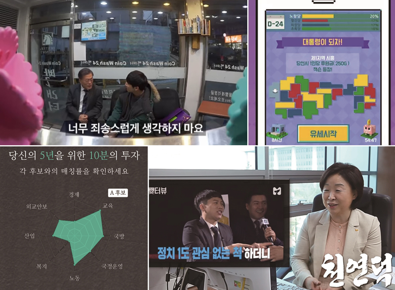 SBS 비디오머그는 각 대선주자들의 과거 행적 및 현재 방향성을 4분 분량으로 압축한 동영상을 제작했다. JTBC 역시 소셜스토리부 페이지를 통해 유사한 콘셉트로 후보들의 소개 영상을 1분 남짓 분량으로 공개하고 있다. 직사각형이 아닌 정사각 사이즈로 만든 것이 특징이다.