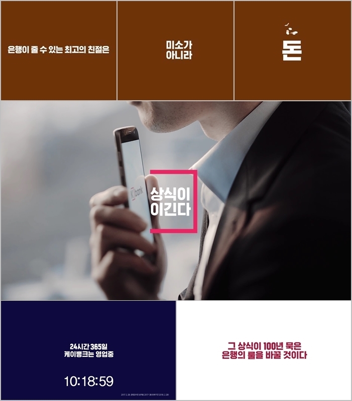 화려한 비주얼, 매력적인 성우 내레이션으로 완성된 광고물들이 이미 많이 나오고 있는 와중에 케이뱅크의 출범을 가장 주목도 있게 알릴 수 있는 방법이 필요했습니다. 케이뱅크가 전하는 새로운 상식을 간결한 텍스트로 표현했다면, 메시지의 전달력을 증폭시킬 장치는 바로 배경음악이었습니다.