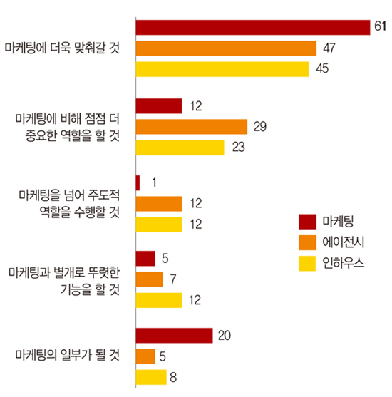 PR회사(에이전시) 소속 응답 비율이 47%였고, 기업 PR부서(인하우스)는 그보다 약간 낮은 45%였다. 흥미로운 건 같은 질문에 대해 마케팅 전문가들의 답변률은 61%에 달했다는 점이다. 한편 PR이 마케팅의 하부가 될 것이라는 소수 의견(인하우스 8%, 에이전시 5%)도 있었다.