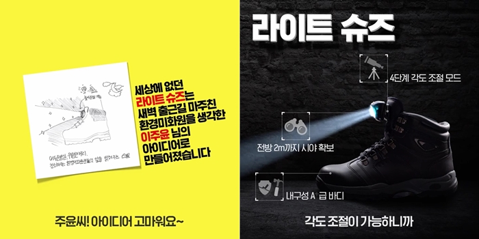 공모전에 출품된 수많은 아이디어 중 새벽 불빛도 없이 어두운 시간에도 위험한 환경에서 수고하시는 환경미화원들이 안전했으면 하는 마음을 담아 실제로 신발에 라이트를 달아 제품을 만들었다. 특히 평소에도 신을 수 있게 라이트가 탈부착 가능한 워커화로 제작해 중랑구청 소속 환경미화원들에게 전달했다. 선물을 받고 밝게 웃으며 인사하던 미화원들의 모습이 가장 큰 성과였다.