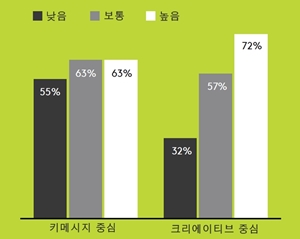 크리에이티브형 광고의 경우 몰입도의 낮음-보통-높음 수준에 따라서 판매 점유율이 각각 32%, 57%, 72%로 상승하는 것으로 조사된 것. 다만, 광고의 핵심(key) 메시지에 있어선 판매율 예측에 큰 차이가 없었다.