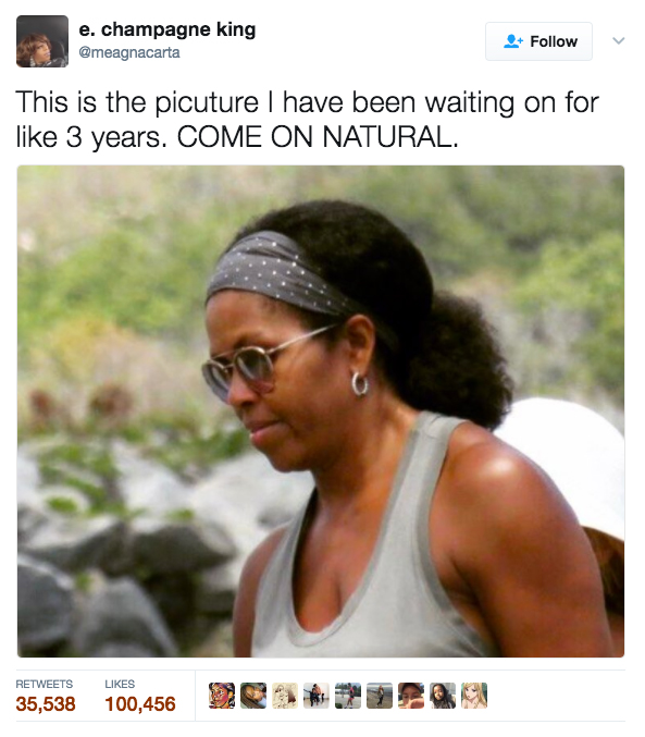 @Meagnacarta라는 핸들을 쓰는 한 트위터 이용자가 흑인 특유의 곱슬머리인 아프로 헤어스타일을 한 미셸 오바마의 사진과 함께 “이게 바로 내가 지난 3년 동안 기다렸던 사진이다. 자연의 머리로 돌아오라”(This is the picuture I have been waiting on for like 3 years. COME ON NATURAL)는 트윗을 올렸는데, 10만명 이상이 ‘좋아요’를 누르고 수만명이 공유(RT)했다.