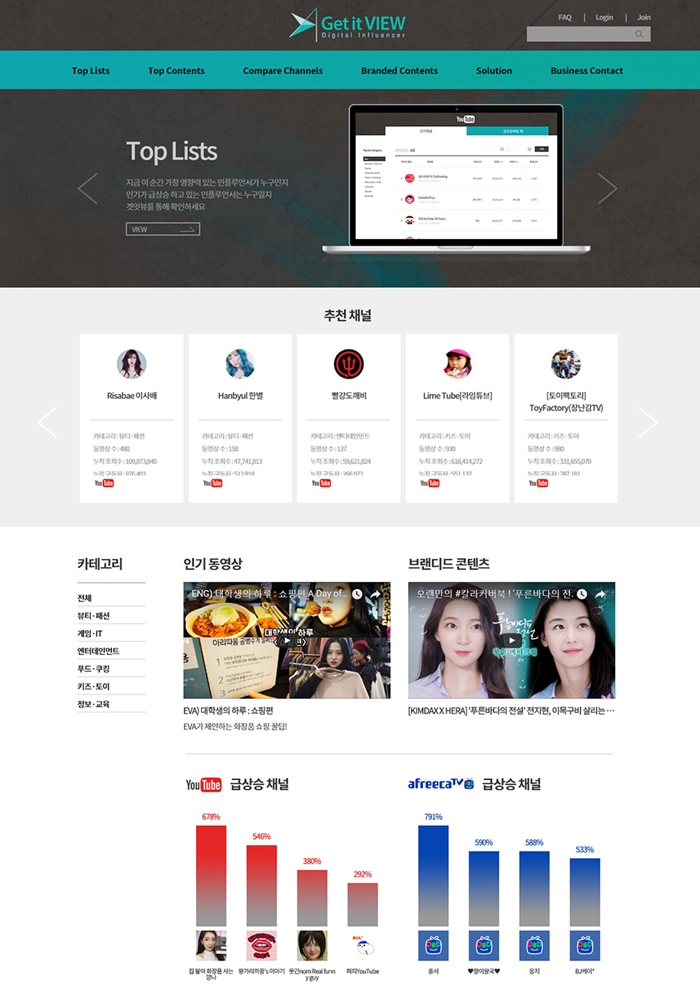 GIV랭킹 외에도 인플루언서별 추천 업종, 콜라보 콘텐츠 사례 등 다양한 정보를 겟잇뷰 솔루션 웹사이트에서 회원제로 서비스한다.
