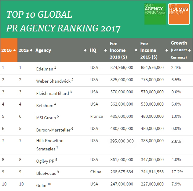 10대 PR회사의 수입은 51억 달러로 전체의 절반 가까이를 차지했지만, 성장률은 평균의 절반에도 못 미치는 3.3%였다. 10대사 가운데 유일한 독립(비상장)회사는 1위인 에델만이다.▷관련기사: 에델만 회장 인터뷰