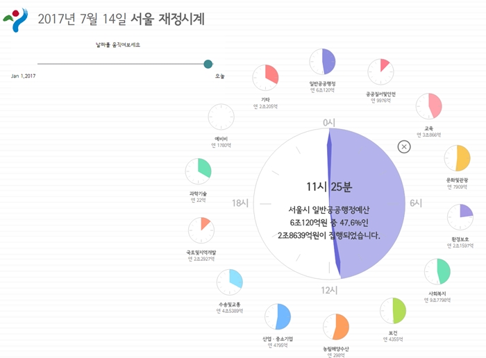 서울시는 24시간 시계 형태로 구현한 ‘재정시계’로 예산상황을 쉽게 이해하도록 했습니다. 과거로 스크롤해 재정 지출 현황을 확인할 수 있도록 했습니다. 데이터를 잘 모르는 사람도 새로운 인프라와 투명한 공개정책의 혜택을 누릴 수 있다는 이점이 있습니다.
