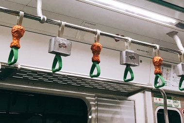 #. K씨는 퇴근길 지하철을 탔다가 진풍경을 마주했다. 전동차 내 손잡이마다 닭다리와 철가방이 달려있었다.