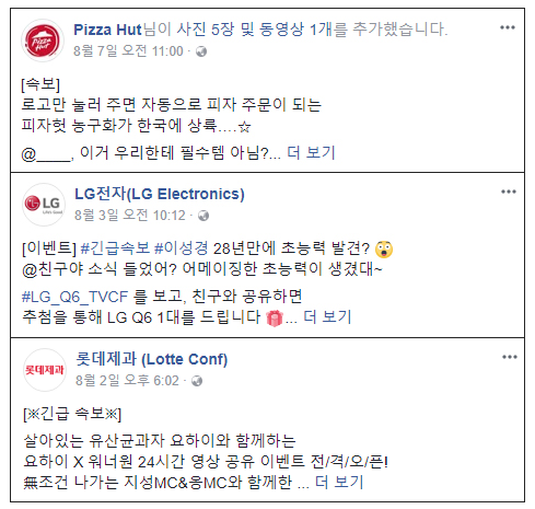 피자헛은 최근 자사 페이스북에 ‘[속보]’를 붙여 “로고를 누르면 피자 주문이 되는 농구화가 한국에 상륙했다”는 소식을 전했다. 또 LG전자는 신형 스마트폰 Q6의 모델 이성경이 “초능력을 발견했다”는 궁금증을 유발하는 멘트와 함께 ‘#긴급속보’ 해시태그를 덧붙였다.