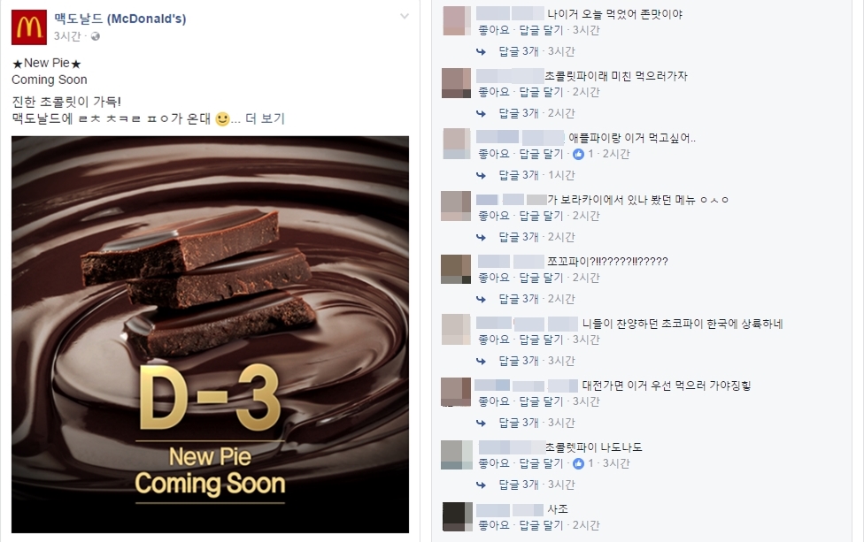 초콜릿이 듬뿍 함유된 신제품 파이 게시물 하단으로는 이용자들이 서로 태그를 걸며 “나 이거 진짜 먹고 싶었어”라거나 “이거 실화?” “먹으러 가자” 등의 멘트가 줄을 잇는다. 댓글 수는 무려 1000여개에 육박한다.