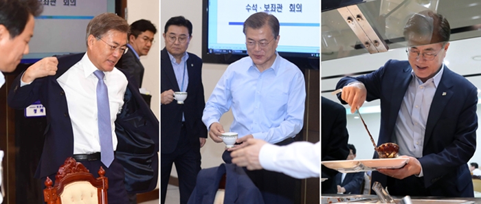 낡은 구두와 짝퉁 양말, 한편의 미드를 떠올리게 하는 티타임 사진. 문재인 정부의 출범은 인간미 넘치는 장면들로 장식됐다. 정책적 추진 사항에 있어서는 신속함이 돋보였다. 업무지시 1호로 일자리위원회를 설립하고, 취임 3일 만에 찾아간 인천공항에서는 비정규직의 정규직화를 약속 받았다. 공감과 파격을 오가는 행보 속 대통령의 PI(President Identity) 전략이 엿보인다. ① 셀프 커피와 낡은 구두의 함의 [더피알=안선혜 기자] 수석보좌관 회의가 시작되기 전 각자가 자신의 잔에 커피를 따른다. 회의는 원탁에서 진행된다. 언론의 사진 촬영 요청에 장하성 청와대 정책실장이 어느 자리에 앉아야 할지 몰라 머뭇거리자 문재인 대통령이 “순서가 따로 없다”며 “앞으로 오는 순서대로 앉을 것”이라 말한 건 상징적이다. 5월 10일 취임 이후 문 대통령은 다양한 방식으로 자신의 국정 철학 및 정책 방향성을 표출했다. 이 기사의 전문은 유료회원에게만 제공됩니다. 매거진 정기구독자의 경우 회원가입 후 로그인 하시면 기사를 볼 수 있습니다. 이 기사를 공유합니다
