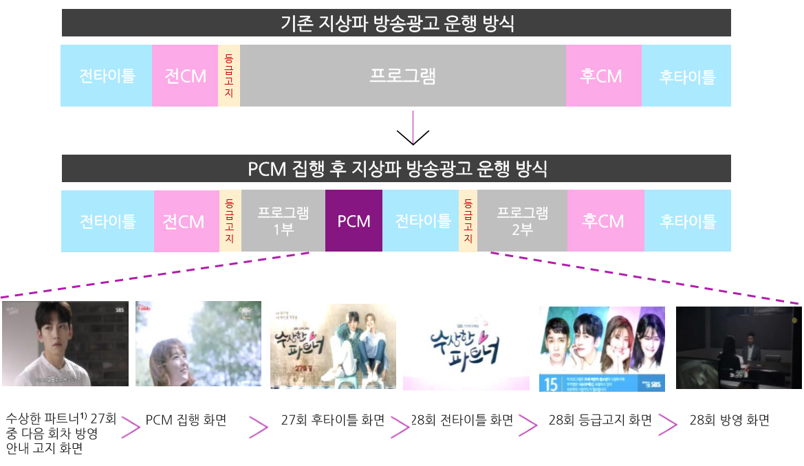 현행법상 지상파는 중간광고를 도입할 수 없음에도 2015년 광고총량제 규제 완화 이후 PCM(Premium Commercial Message)란 이름 아래 ‘꼼수’를 사용해왔다. 특히 올해 들어선 지상파 3사 모두 예능 프로그램은 물론 드라마까지 쪼개는 식으로 유사 중간광고에 공격적으로 나서고 있다. ▷관련기사: 지상파 중간광고, 제도 보다 앞서 시행?